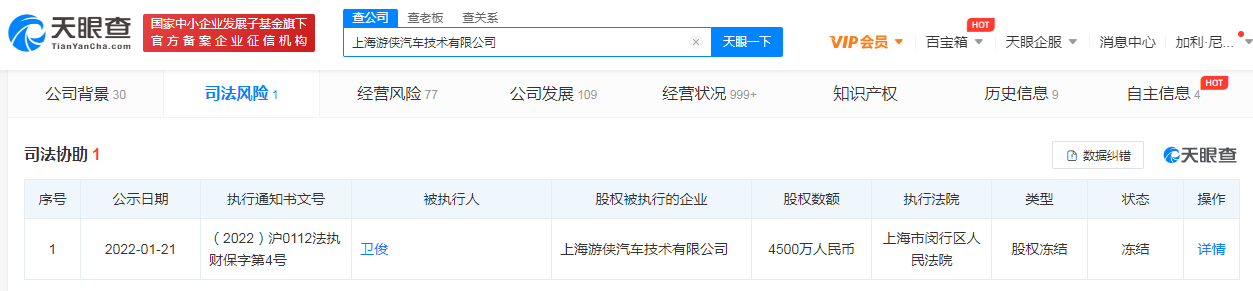 天眼查App显示,1月21日,上海游侠汽车技术有限公司新增股权冻结信息,被执行人为游侠汽车董事长卫俊,冻结股权数额为4500万人民币,执行法院为上海市闵行区人民法院。