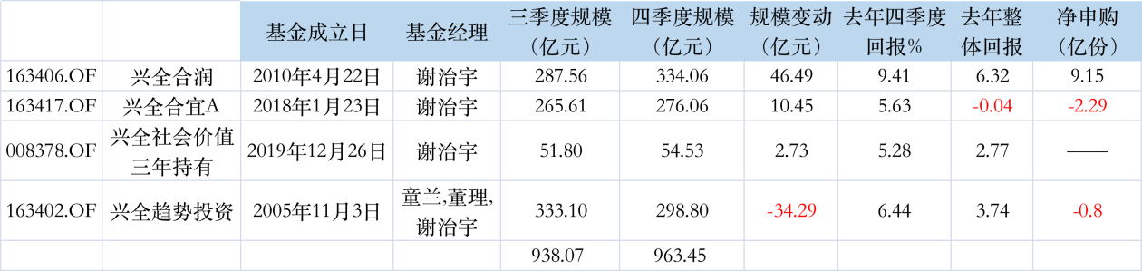 由于四季度兴全趋势投资规模缩水34.29亿,谢治宇无缘千亿队列。