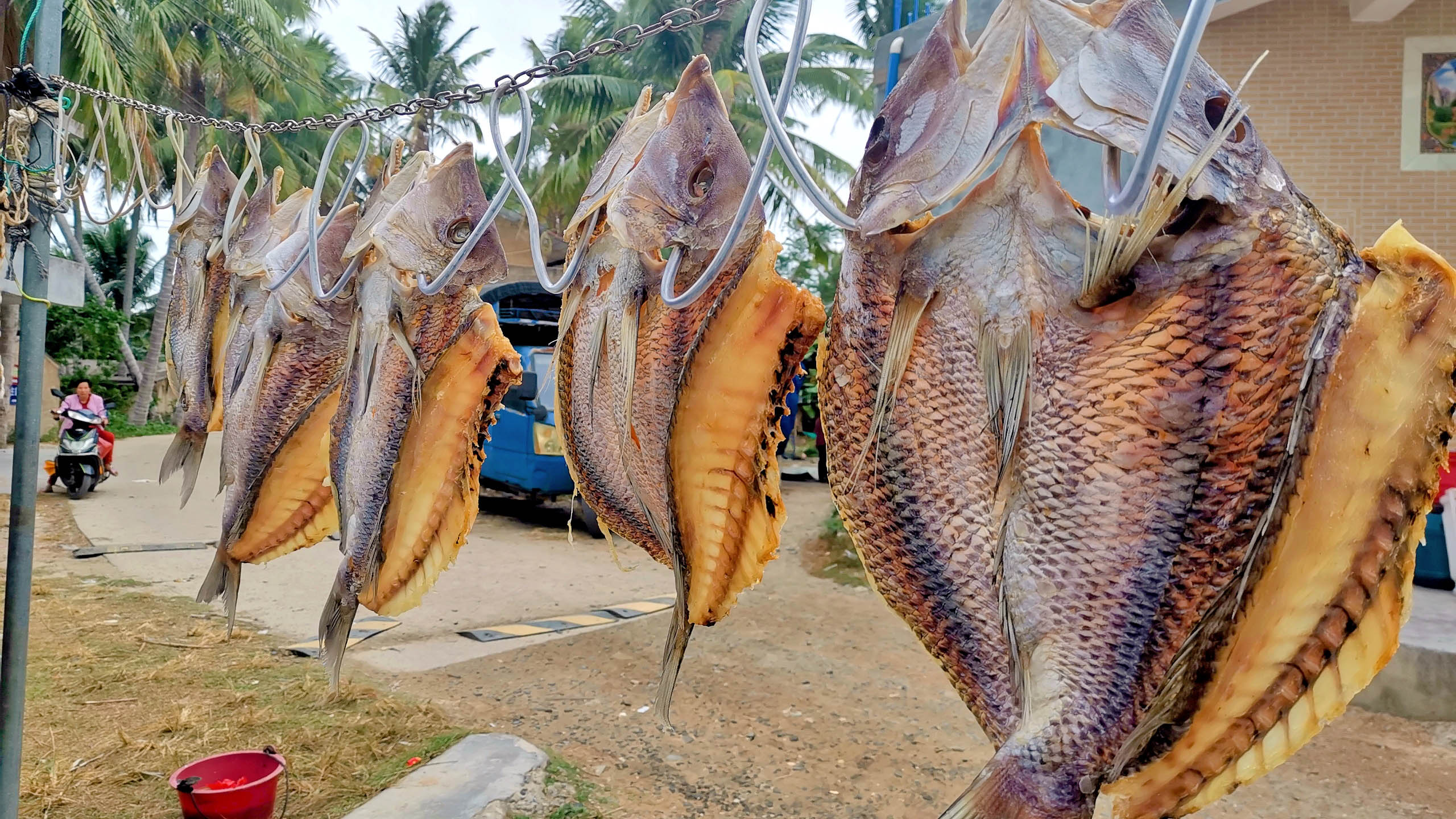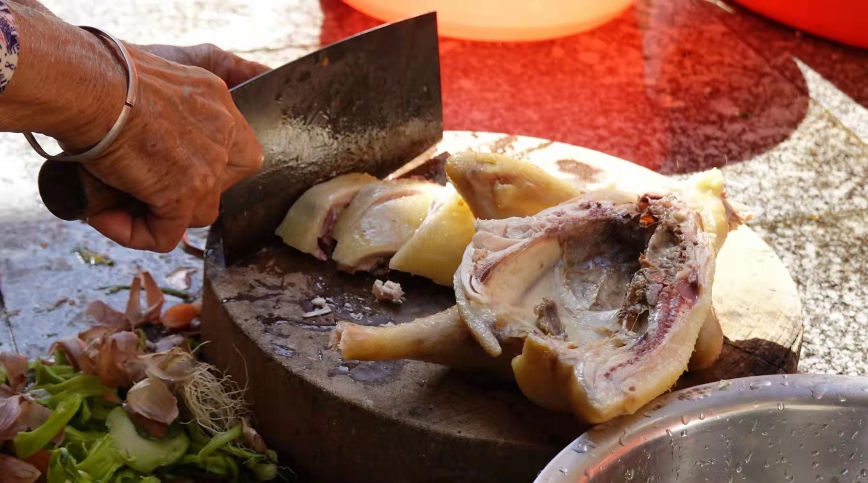 海南的年饭可以从大年三十延续到正月十五,每顿的餐桌上必然有白切鸡,无论是拜祭祠堂还是亲人聚餐都少不了这一道主菜。2021年下半年突然反弹的疫情让陈慧敏一家都开心不起来,女儿不能回家过年,陈妈妈已经早早准备家乡的年货寄往澳门。“既然一家不能团聚过年,那就一起吃鸡过年。”陈妈妈的笑声里藏着不舍。除了文昌鸡,她还给女儿准备了马鲛鱼,海南本地的咸鱼干、肉粽,还有6个去皮的青椰。
