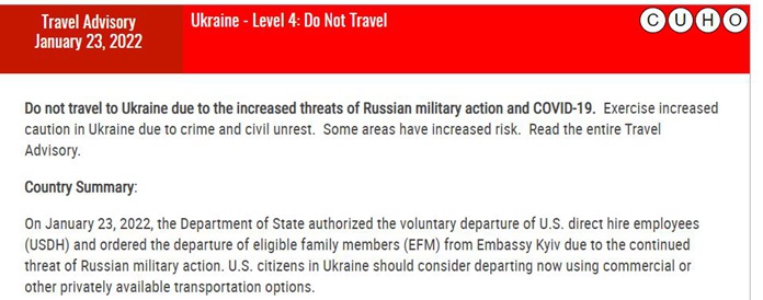 当地时间1月23日,美国国务院更新旅行警告,将对乌克兰和俄罗斯的旅行警告升为最高级第四级“不要旅行”。