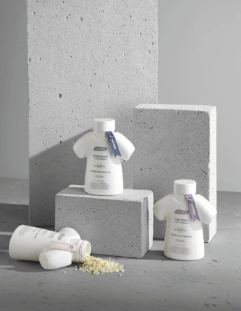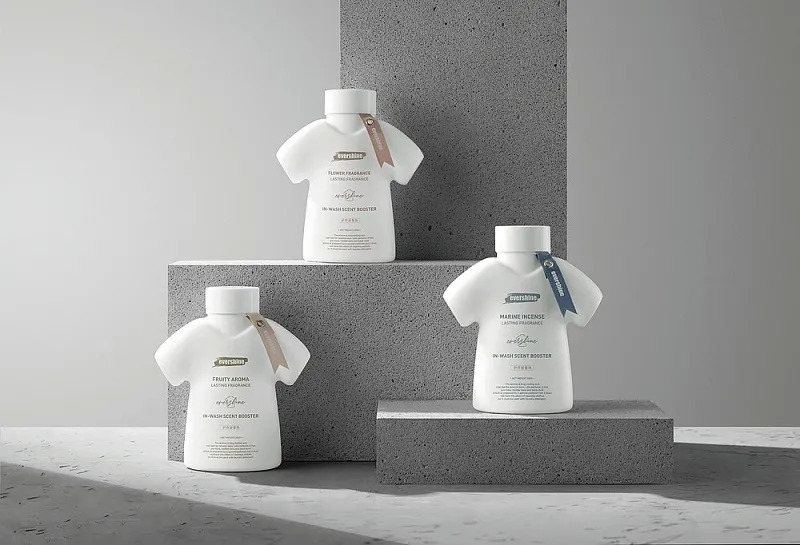 这款产品的包装设计灵感来自家庭洗衣场景和产品的功能特性。包装以服装的形状,使消费者第一眼就能掌握产品的功能与作用——洗衣留香珠。品牌表示包装选用白色,是因为能向消费者传达亲和力,同时能够传递洁净的效果。领口区域的丝带设计增加了整体外观的活力。彩带和文字的颜色与留香珠球的颜色相匹配,用户可以通过包装的颜色来识别产品的香味。此外,瓶盖还可以作为量杯使用。