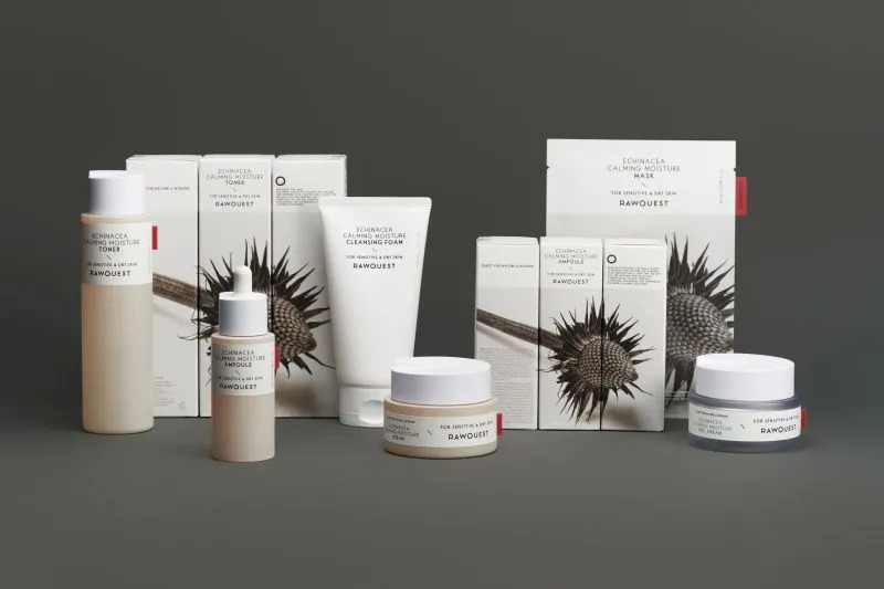 RAWQUEST芮凯诗由韩国狮王株式会社推出,是一个护肤品牌,主张从草本中寻找有效成分。产品包括紫锥菊镇静保湿霜、安瓶、爽肤水、洁面、面膜等。包装则有效地传达了产品配方的主要成分紫锥菊这一元素。受紫锥菊的故事和颜色的启发,设计师创造了独特和美观的容器。同时包装上的图形还巧妙地使用了紫锥菊植物的颜色和图像。