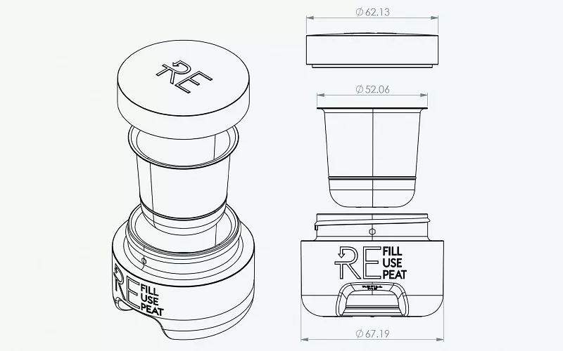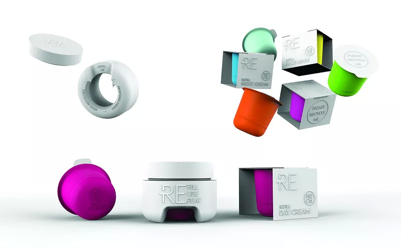 荷兰公司 FASTEN 设计了一款可重复使用的面霜罐,不仅外观时尚美观,同时还实现可持续利用。该产品由可回收聚丙烯制成,包装全部可以再资源化,且各部分均仅采用这一材料,有效实现可回收。此外,相较于标准面霜罐,这款面霜罐制作用料减少 70%。该作品罐身重量减轻、替芯可堆叠放置,可大大降低运输过程中二氧化碳排放量。同时包装印花用沈花制法的工艺代替墨水,用折叠纸板的方式代替胶水粘纸,减少不必要的材料,使得包装变得更加环保。凭借这一设计概念,Fasten成功拿下德国IF奖专业概念类别金奖。
