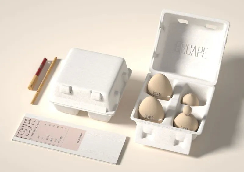 这款由深圳柏星龙设计的液体粉底包装,设计灵感来自于鸡蛋盒。粉底液瓶子呈鸡蛋形状,部分透明,消费者可以通过透明部分区分不同的液体颜色。外盒看起来像一个纸鸡蛋盒,由可持续材料制成,强调产品配方中使用的天然成分。标签则模仿了药方处方,说明每种粉底液有助于缓解哪些皮肤问题。