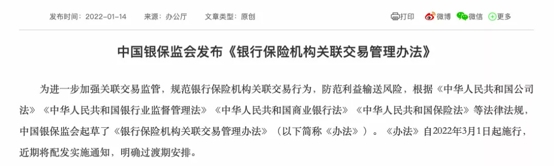 1月14日发布的《关联交易管理办法》,主要针对的是银行业保险业关联交易行为,是对银行保险机构关联交易的管理。该办法是对关联交易乱象的整治,以及防范利益输送风险。2022年3月1日起执行。