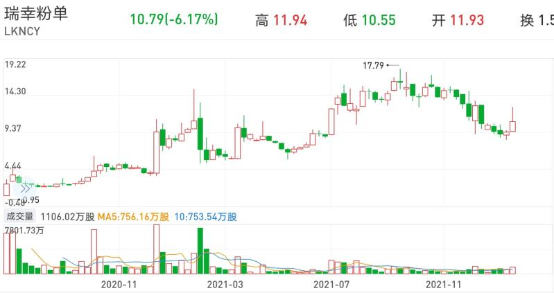 2020年6月29日退到粉单市场,瑞幸咖啡开盘价为0.98美元,之后并没有一蹶不振,反而呈现震荡走高的姿态,2021年创下17.79美元的高价,以此计算涨幅高达17.15倍。