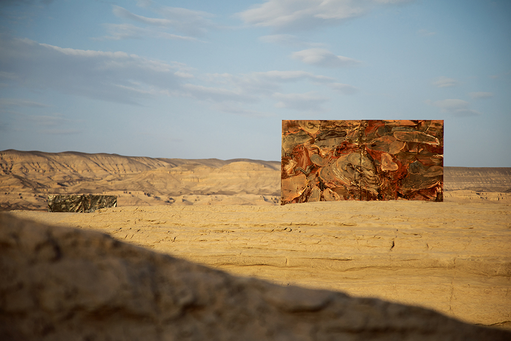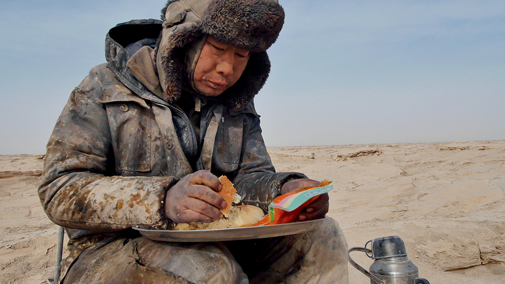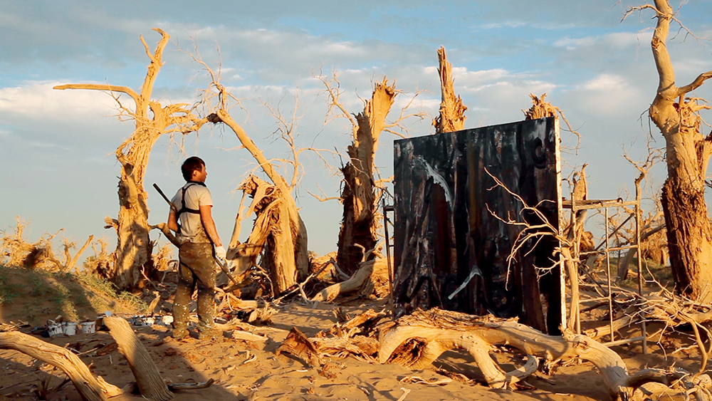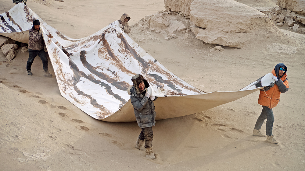 正午:把那些画埋在地下,你说这是大家一起商讨出来一个方案,上面压了很多树。我看视频里,当把镜头拉高的时候看,在沙漠当中,那些画就像恐龙的骨骼一样。大自然带给你哪些意外的东西?