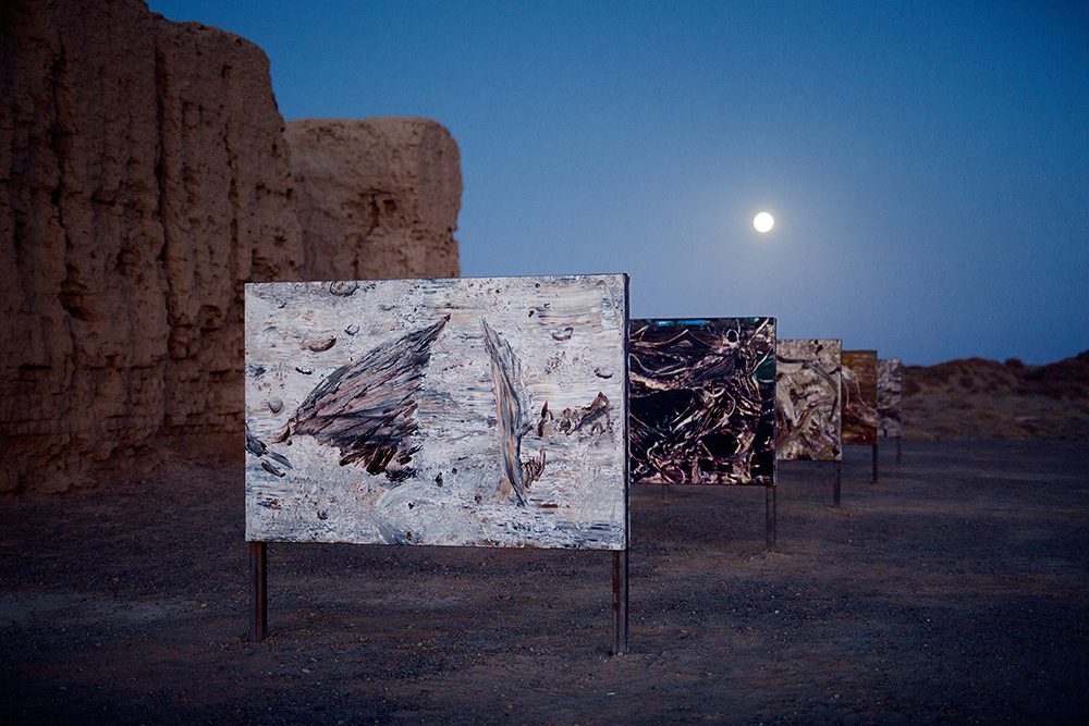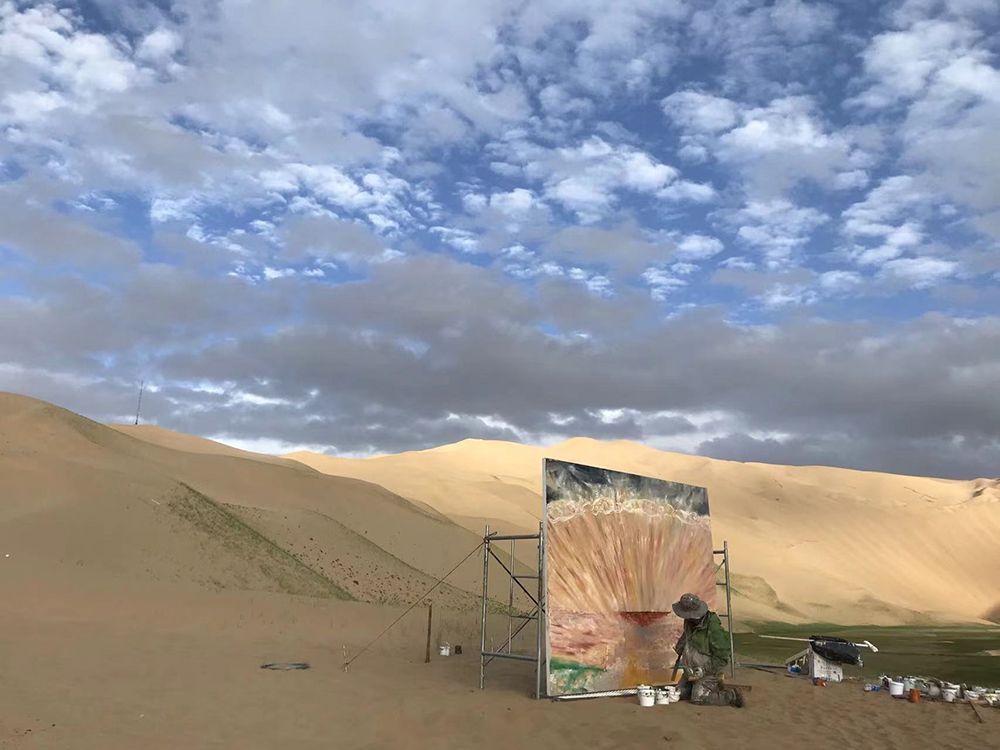 过去十年间,刘商英在西藏阿里、内蒙古额济纳旗、新疆罗布泊和阿尔金山,不断开启自己在荒野上的绘画项目。在这些常人无法到达的荒野之地,他风餐露宿,仅仅维持最低的生存需求,将自己的大幅画布置于户外,进行长达几十天的绘画行走。他想以此方式探索绘画最原始的灵感和意义。期间他还在内蒙古额济纳旗红城遗址和新疆托克逊红河谷完成了两次自然场地的个展。