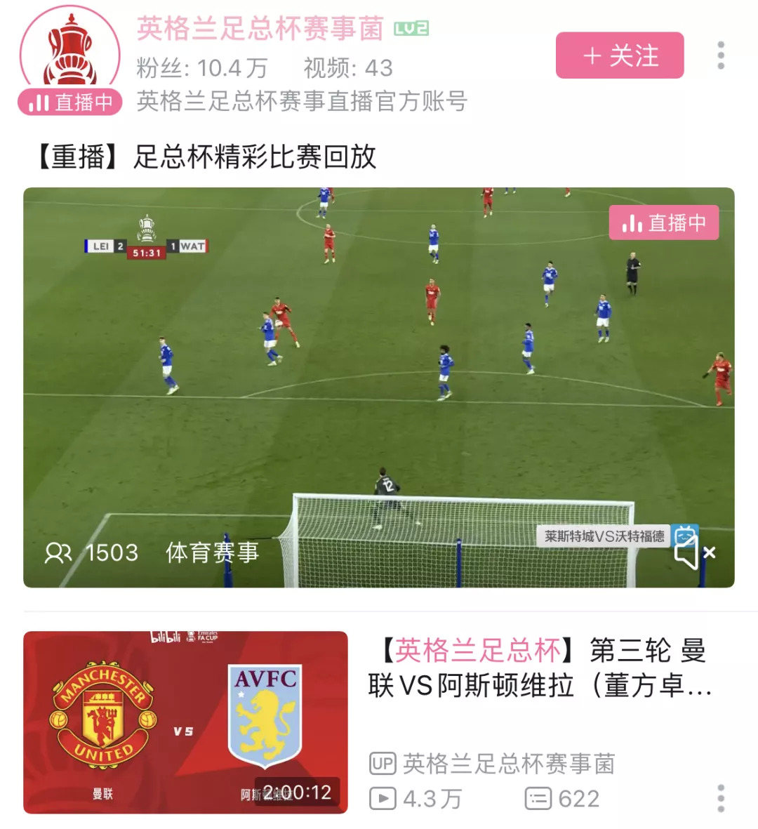 此外,B站请来了詹俊、张璐、董方卓等足球名嘴,解说重点场次;并开通“英格兰足总杯赛事菌”官方账号,发布比赛集锦、精彩进球等,目前上传43条视频,累计逾10万粉丝。