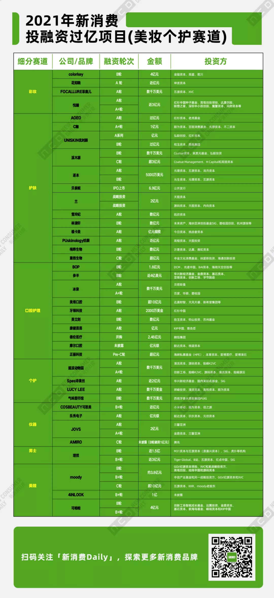 值得关注的是,无论是从亿元项目,还是各细分赛道来看,数量最多的两个细分品类:1、护肤,绝大多数品牌都是功能性、成分护肤;2、口腔护理,从消费品到医疗机构。