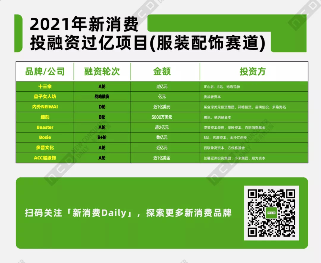 就2021年的融资过亿项目来看,也能看到,资本市场对细分市场的关注更高,在8起过亿项目中,除细刻为快时尚品牌,有6起融资均是此。