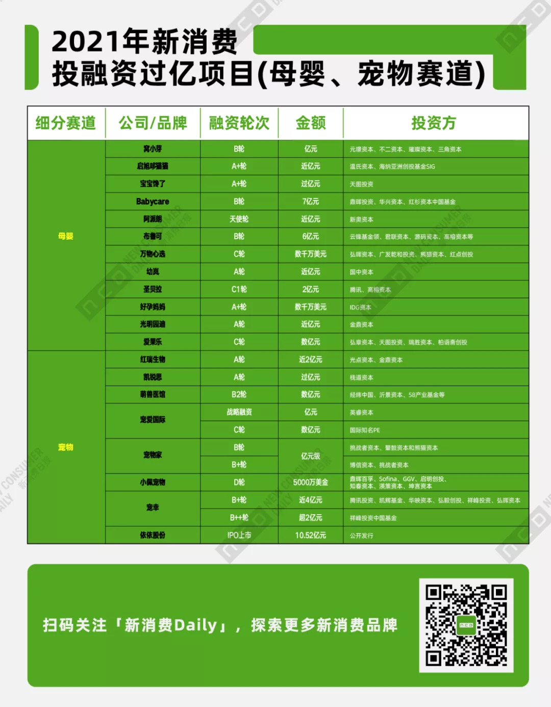 总的来说,母婴、宠物两大赛道的细分品类赛道过于分散,过亿项目也较分散,主要集中在1、在新消费浪潮中,发展较快的、引领方向的新生力量;2、产品和品牌都经受住了市场和用户的考验,发展时间并不短。