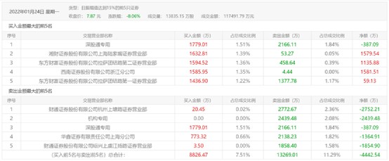 根据当天龙虎榜“买入前五名与卖出前五名”的总合计情况,总买入8826.47万元,总卖出13269.01万元,净卖出4442.54万元。