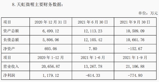 截止到2021年9月30日,天虹微喔的总资产为1.05亿元,总负债为1.07亿元,净资产已经为-152.67万元,而且在2021年前9个月营业收入2.11亿元的情况下,净利润为-774.80万元,处于亏损的状态。