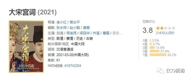 以网评“烂片”头头为例,豆瓣评分3.8的《大宋公祠》虽然定位是历史剧,但是剧情楞是有种野史的感觉。剧情进展速度被网友吐槽“坐火箭”、“PPT”、“快看瞎了”。