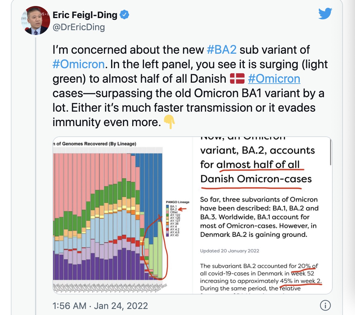 美国流行病学家Eric Feigl-Ding用图表解释称,从数据图可以看出,BA.2病例(上图中浅绿色部分)正在快速增长,几乎占到丹麦奥密克戎病例的一半。他解释称,要么是因为BA.2的传播速度更快,要么是它的逃避免疫能力更强。