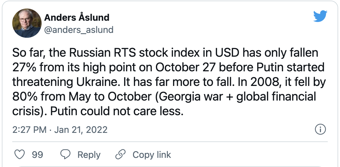 阿斯伦德指出,到目前为止,俄罗斯RTS指数仅从10月27日的近期高点下跌了27%,当时普京还未开始威胁乌克兰。“未来还有大跌的时候。2008年,格鲁吉亚战争和全球金融危机期间,该指数跌了80%,普京根本不在乎。”