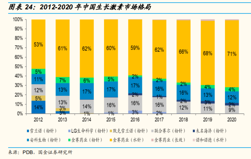 目前,粉针竞争相对充分,有金赛、安科生物、联合赛尔等7家公司,水针有金赛、安科生物、诺和诺德三家,长效市场则是金赛独占。