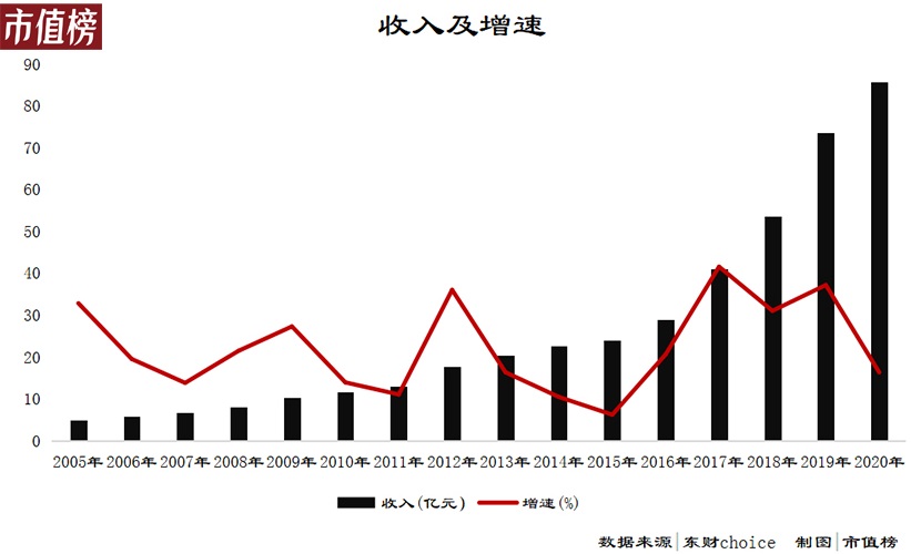 受益于金赛药业业绩增长,长春高新成为小赛道中的高成长股票。从2005年水针上市到2020年,15年时间,长春高新的收入增长了16.6倍,达到85.77亿元,股价也节节高升。
