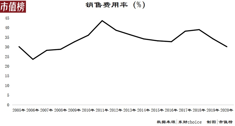 长春高新的销售费用占收入的比重,高的时候超过了45%,2020年为30.11%。