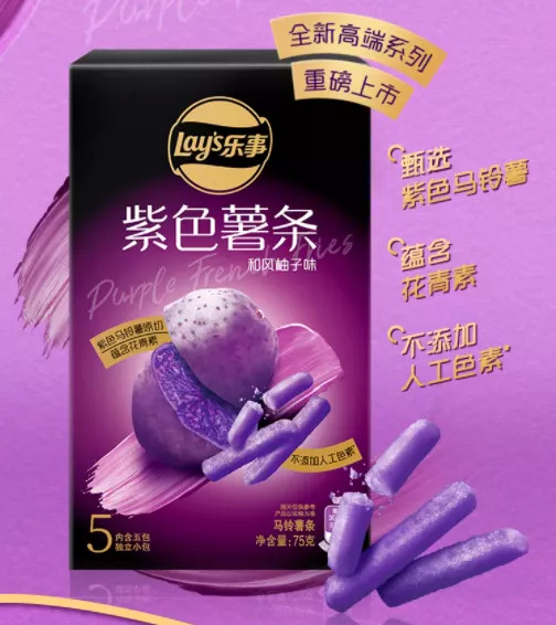 乐事在产品创新方面同样值得称赞。除了在口味上的花样创新,乐事也会考虑到如何将传统的薯片乐趣与消费者需要的健康和功能的需求相结合,例如乐事中国在2021年推出的紫色薯条,将口味设定为新奇的和风柚子味。采用蕴含丰富花青素的紫色马铃薯作为原料,不添加人工色素,成分简单,一口松脆。每盒内含有5包独立小包装,方便保存的同时也能更好控制热量摄入,旨在从细节方面捕获年轻人。