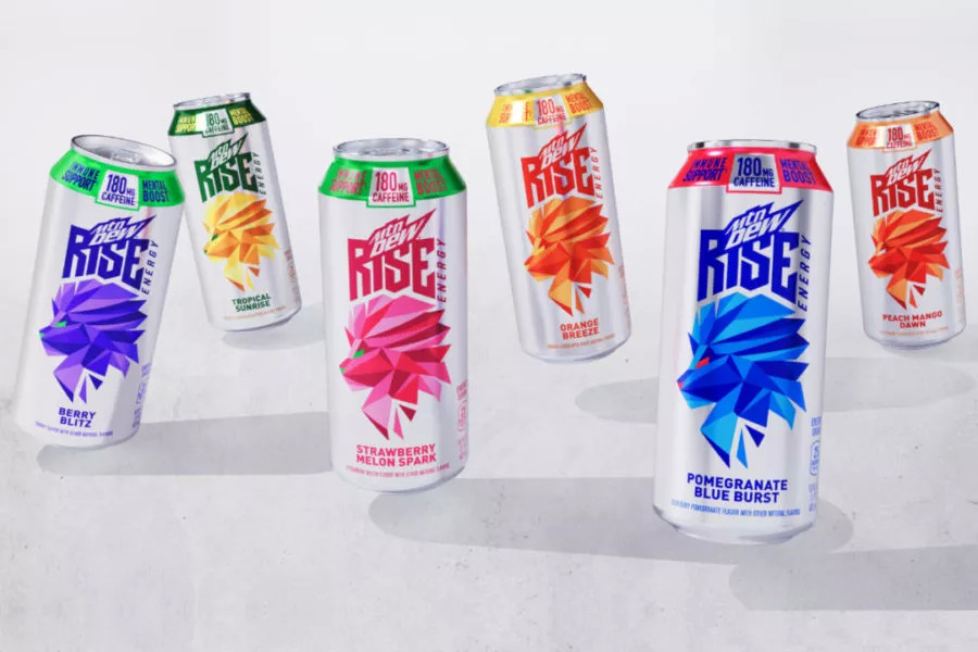2021年3月,百事公司与NBA明星球员勒布朗詹姆斯合作推出Mtn Dew Rise Energy能量饮料,旨在提供精神振奋和免疫支持。饮料不含添加糖,含有25卡路里热量和约180毫克咖啡因(原版MtnDew气泡水为77毫克)、维生素A和C、抗氧化剂、胞磷胆碱、锌和果汁成分。“勒布朗是能量的缩影,他通过把握每天早晨的训练获得了如今传奇的地位”,这与这款能量饮料满足早晨提神、增强专注力和免疫支持的功能需求相得益彰。
