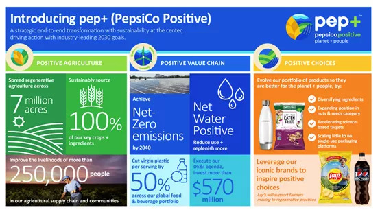 作为全球食品饮料巨头和全球粮食系统转型的积极参与者,百事将在pep+计划指导下规划新的经营路线,即从更可持续的方式采购原料、制造和销售产品,到通过其标志性品牌激励消费者为人类和地球的可持续发展做出贡献,再到在整个供应链中支持社区并改善民生。