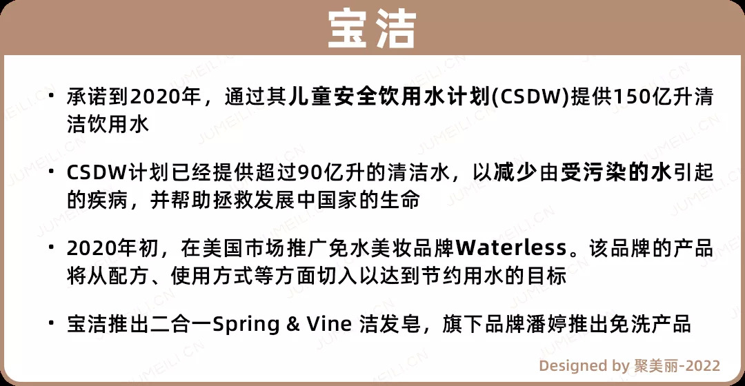 据联合国估计,到 2025 年将有 18 亿人缺水。从2018年3月22日(世界水日)开始,到2028年3月22日结束,这十年被称为“水促进可持续发展”国际行动十年。在这一趋势下,化妆品行业的跨国巨头们纷纷做出“节水”承诺,将节水视作其可持续发展战略中的一个重要组成部分,并且付诸实际行动。在节水理念的品牌推广上,宝洁和联合利华占据了主要地位。