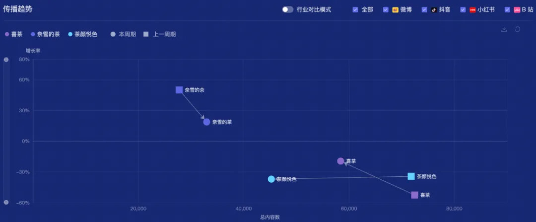 根据时趣洞察引擎,对于茶颜悦色、喜茶和奈雪的茶多社交平台上,近90天的传播趋势进行检索分析,可以看出,茶颜悦色的社交总内容数下降最多,增长率少有下降;喜茶的社交总内容数也有一定程度的下降,但增长率明显;奈雪的茶社交总内容数有所下降,但增长率下降明显。