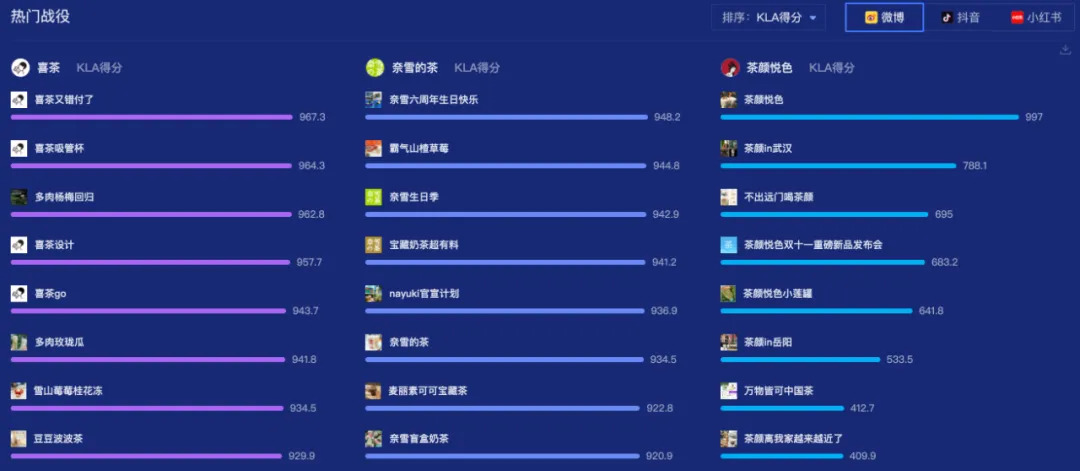 根据时趣洞察引擎,将三个品牌近90天的人们战役进行检索,则可以进一步解释上述的品牌传播趋势数据差异。我们可以看到,茶颜悦色的品牌战役表现集中在#茶颜悦色#一直以来的品牌力累积,其他则是在不同城市开店带来的社交话题,但话题指数均较低;喜茶的品牌战役表现主要集中在产品和设计等,且战役表现良好稳定;奈雪的茶的品牌战役表现则主要集中于不同产品,以及品牌六周年延伸出的社交话题,且均表现不错。