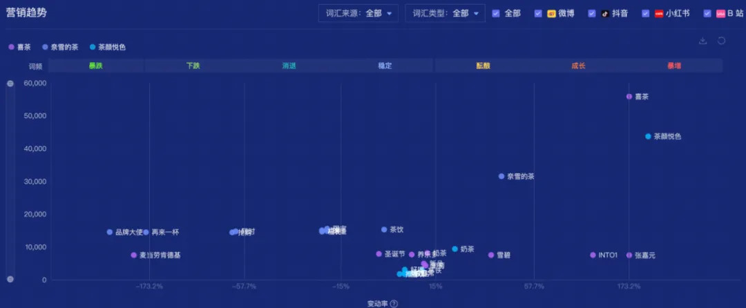 另一方面,根据时趣洞察引擎对于三个品牌营销趋势的检索分析,也可以看出茶颜悦色社交平台讨论还主要集中在品牌名和品类上,而喜茶和奈雪的茶已经有了明星营销、限定营销、联名营销等相对多元的打法。