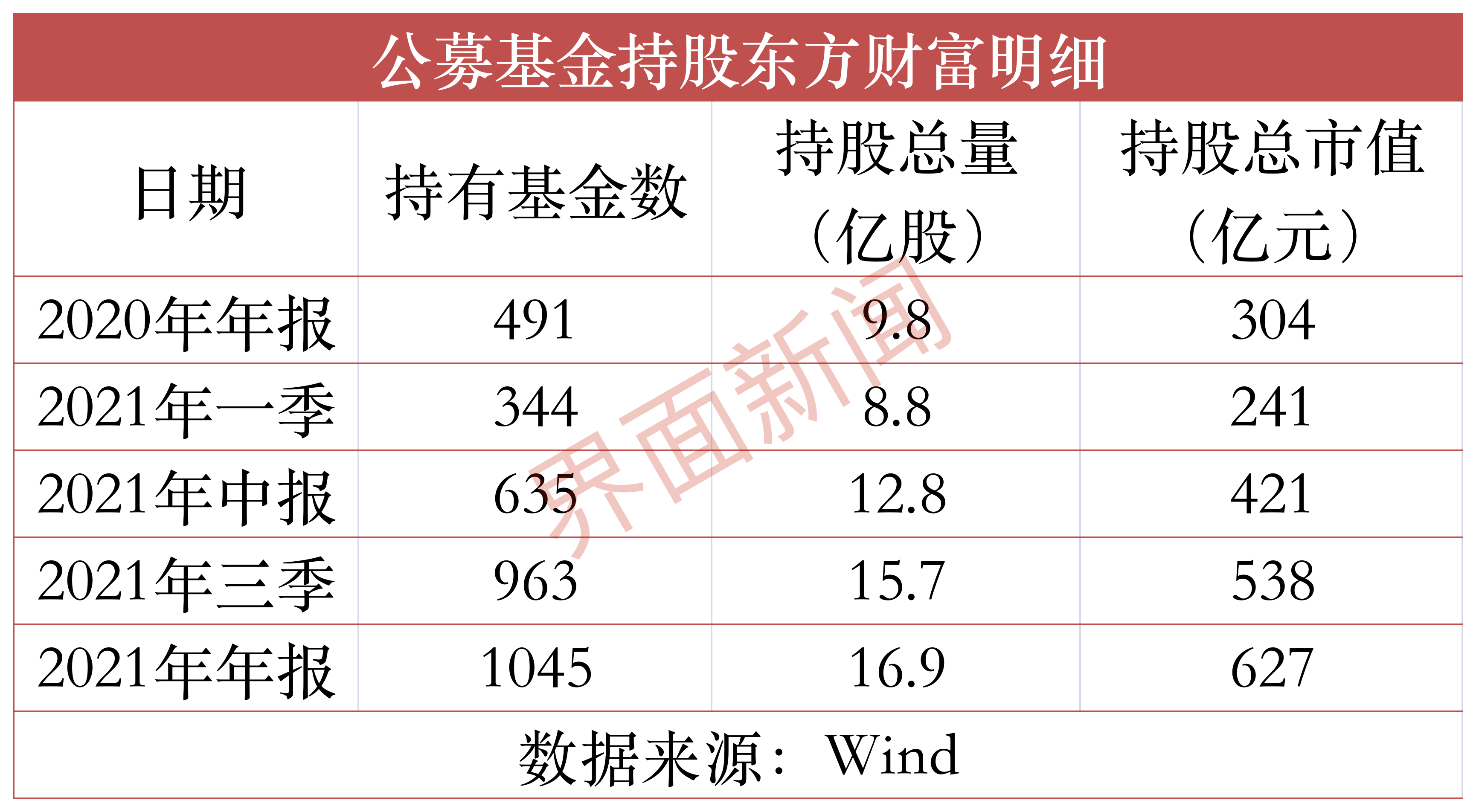 据Wind,自2021年6月底至12月末,分别有635只、963只、1045只基金持有东方财富,持股总市值分别为421亿元、538亿元、627亿元,持仓市值分别环比增长74.7%、27.8%、16.5%。