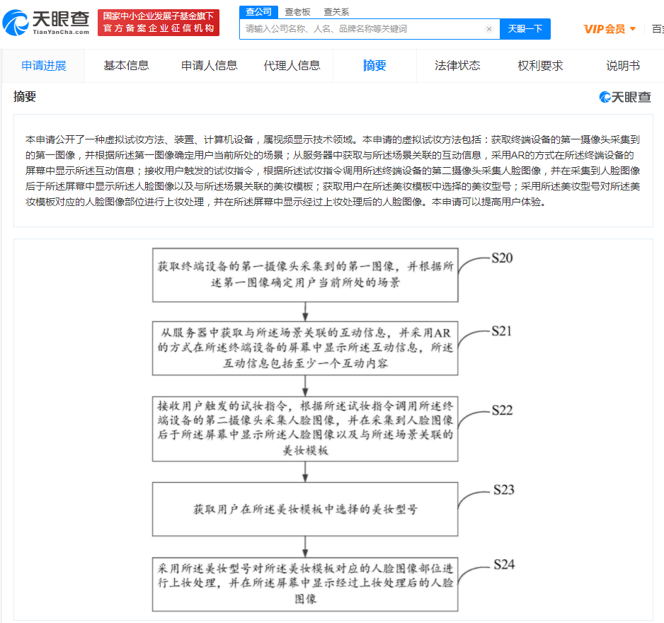 专利摘要显示,该方法通过获得摄像头采集图像,确定用户当前场景,并以AR的方式显示互动信息;用户触发试妆指令后,显示人脸及场景关联的美妆模板;用户选择美妆型号,并经过上妆处理,最终显示妆后人脸图像。本申请可以提高用户体验。