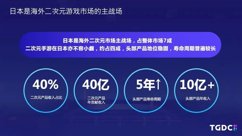 二次元题材手游出海,日本是必争之地。根据腾讯TGDC数据,二次元产品收入占比高达40%,每年贡献40亿人民币收入。
