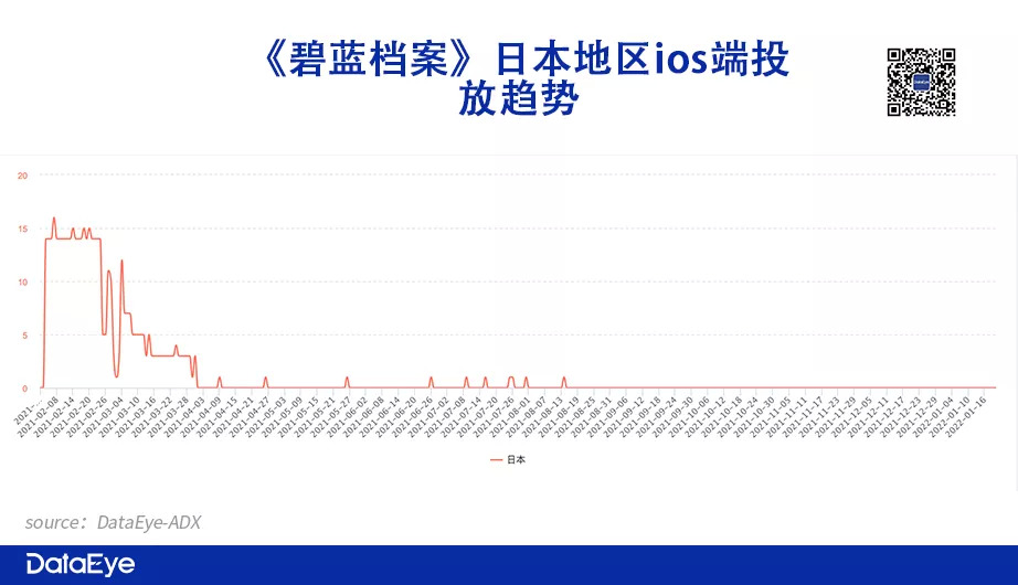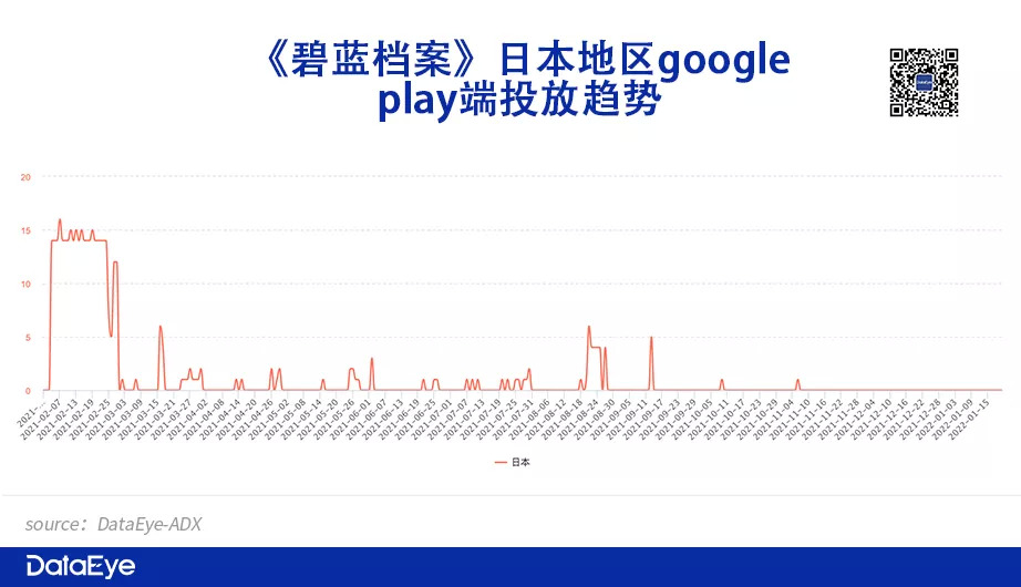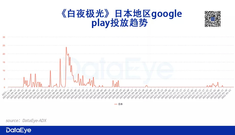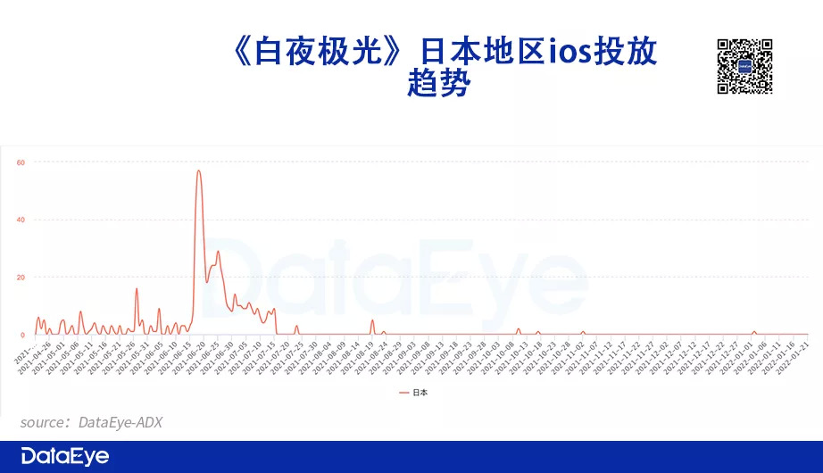 根据DataEye-ADX海外版数据,《白夜极光》在日本市场的投放较少。虽然iOS端占该游戏在海外总投放素材的6.14%(最多),但峰值也不过57组。Google Store则更少,一共不过投放4组而已。