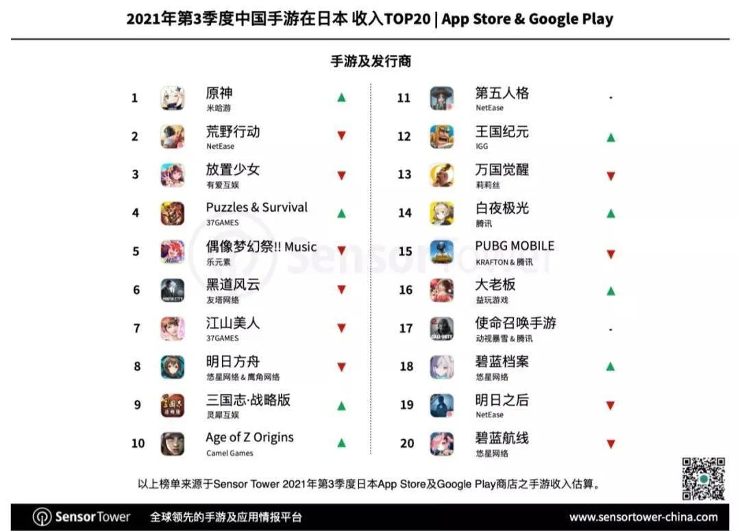 回顾2021年,除了2020年的《原神》大放异彩,《白夜极光》和《碧蓝档案》都是中国二次元手游出海日本的新力军,在日本收入榜上表现不俗。