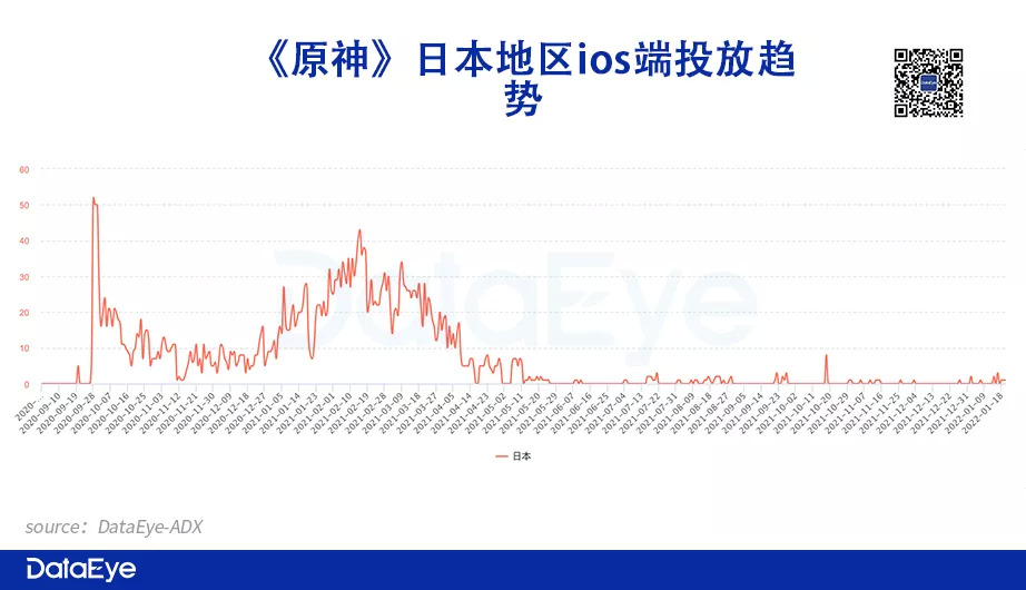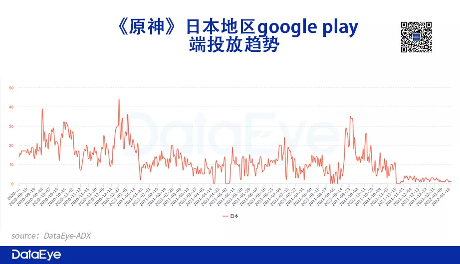 就连《原神》的投放力度同样不突出。iOS端峰值为52组,在大约半年后便放缓了脚步。Google Store端虽断断续续地保持着投放,但峰值也只有44组。
