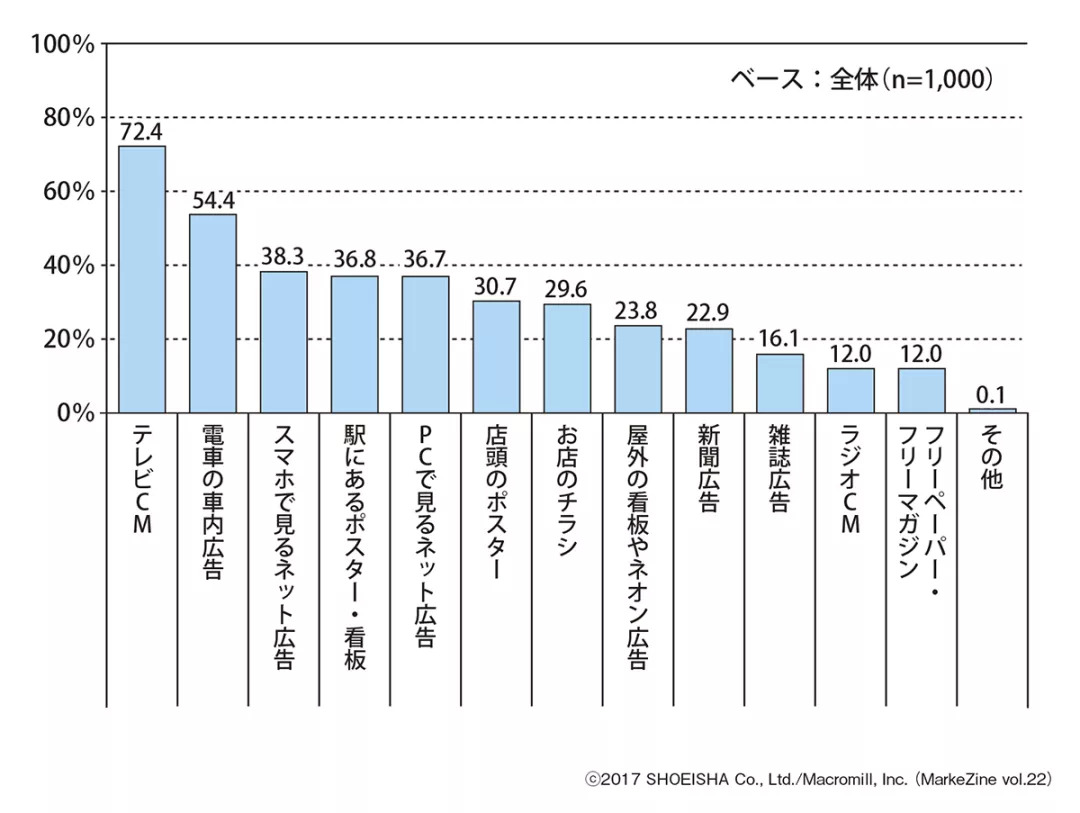 另据统计日本电视广告的触达率达到72.4%,而电车广告有54.4%,店头及站点的平面广告均有30%或以上的触达率。而手机内/电脑端的买量触达率虽接近40%,却有不具性价比且不够垂直的缺点。