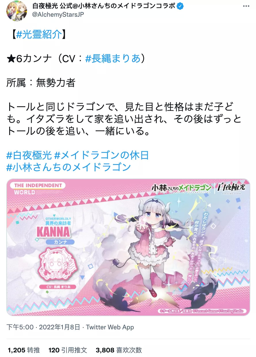《白夜极光》也在今年宣布与大热动画IP《小林家的龙女仆》进行联动,让动画中的角色以光灵登陆游戏。其动画在B站播放超过3.2亿次,这一联动也在推特上引起强烈反响。