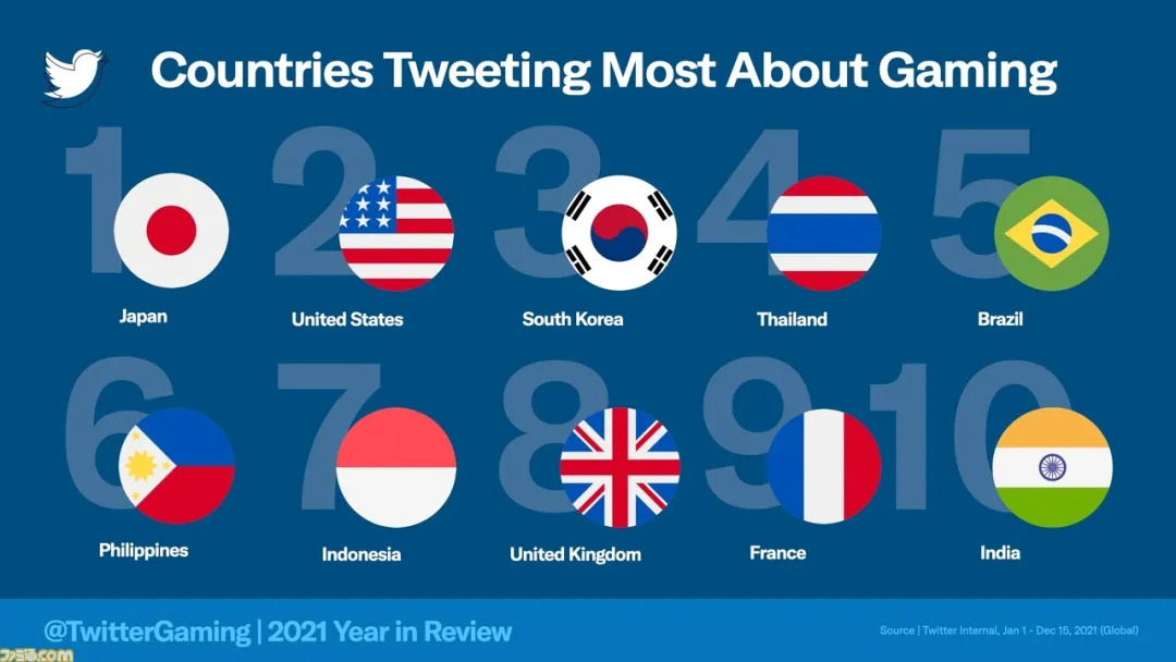 除了权威媒体外,社交媒体同样在情报传播上占据重要角色,推特就是其中的佼佼者。根据TwitterGaming的最新数据,2021年日本为平台中投稿最多“与游戏相关的内容”的国家。