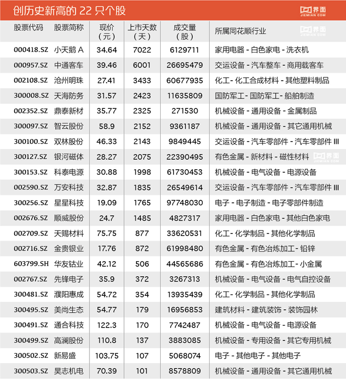 界面新闻梳理发现,截至6月17日收盘,22只个股股价在大幅震荡行情中创下历史新高。按照同花顺行业划分,这些个股大多属机械设备、交运设备、化工、有色、家电及国防军工行业,其中机械设备行业个股占三成。