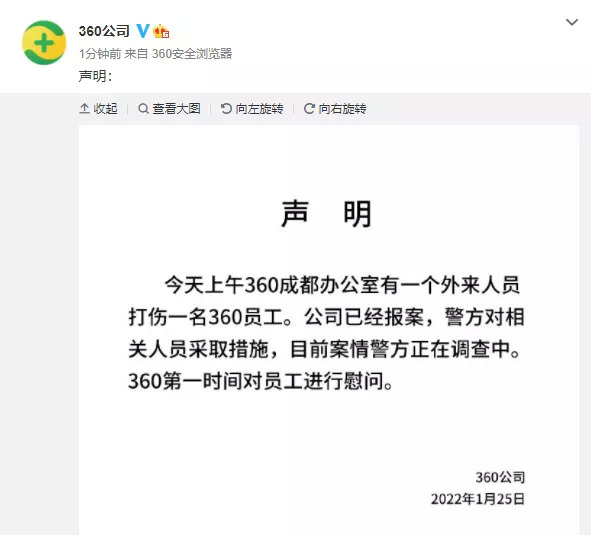 随后,360公司再次通过微博发表声明称,“今天上午360成都办公室有一外来人员打伤一名360员工。公司已经报案,警方对相关人员采取措施,目前案情警方正在调查中。360第一时间对员工进行慰问。"