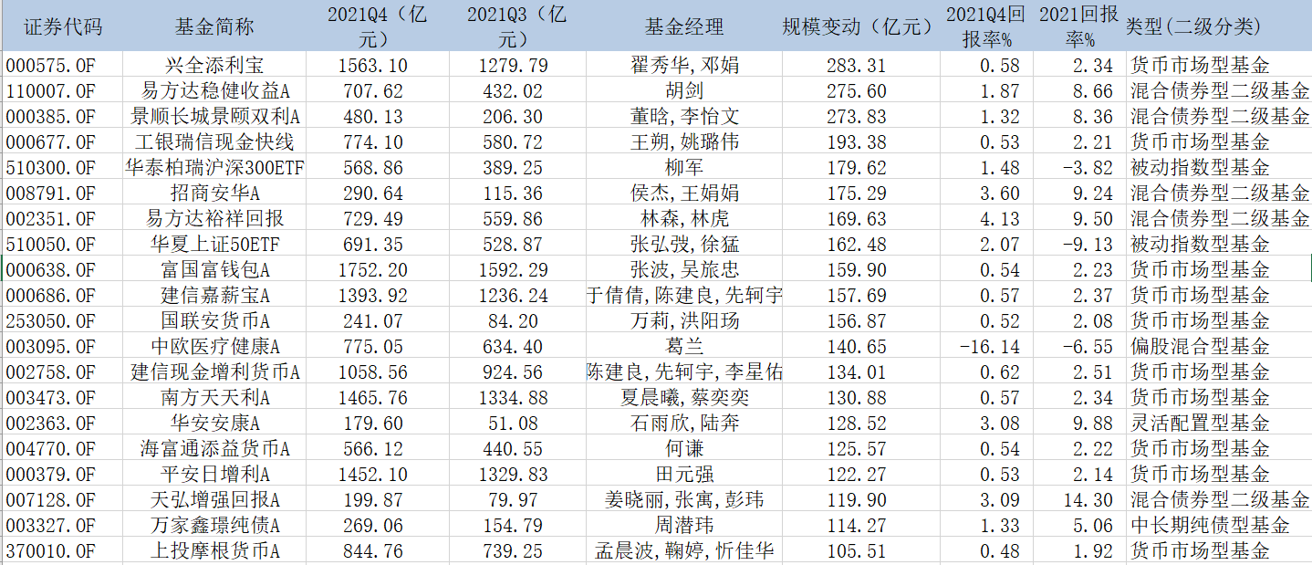 界面新闻记者根据Wind数据,整理统计了市面上全部类型的基金在2021年第四季度规模增加和缩水的前20名,并尝试分析其原因。