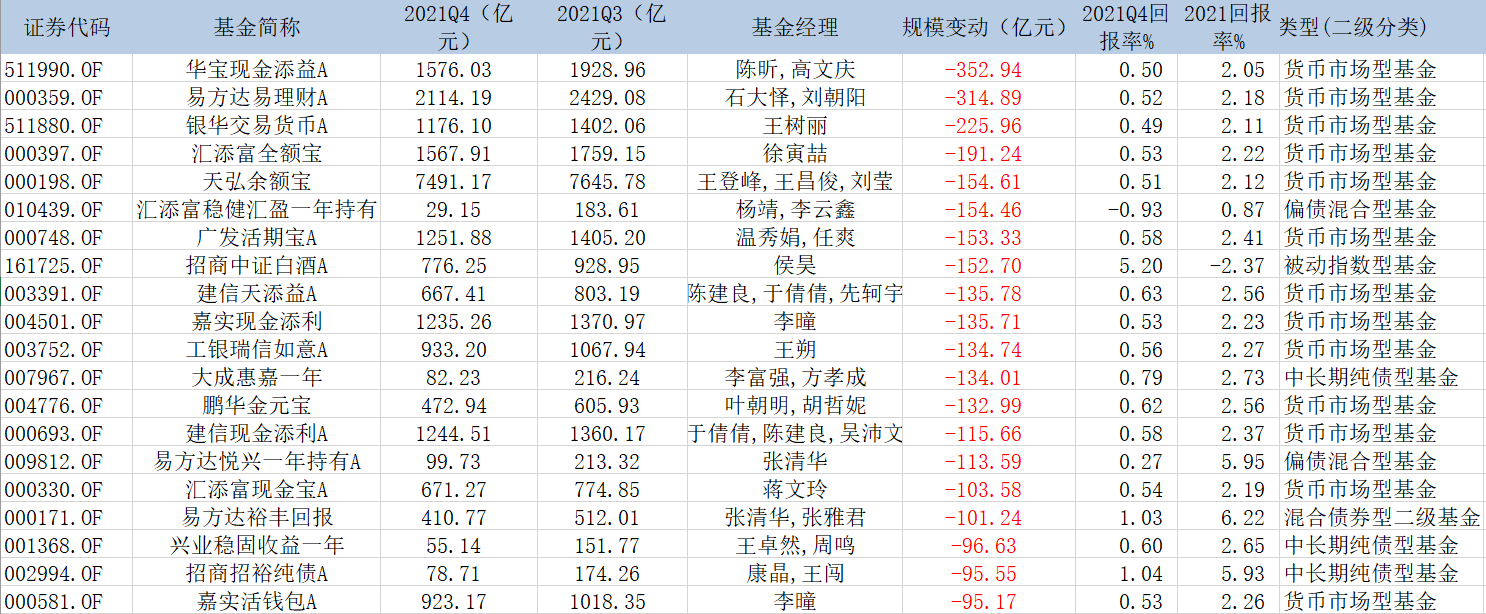 在规模缩水前20名的基金中,有13只货币市场基金,3只“固收+”基金。规模缩水前五名的均是货币市场基金,分别是华宝现金添益、易方达易理财、银华交易货币、汇添富全额宝、天弘余额宝。其中规模缩水最多的是华宝现金添益,该基金四季度减少了352.94亿元。