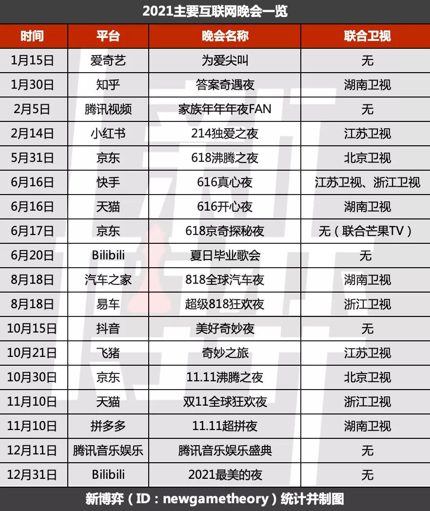 近两年,办一场晚会几乎成了所有互联网大厂的标配。以2021年为例,爱奇艺“为爱尖叫”晚会和腾讯视频“家族年年年夜FAN”晚会在春节前就打响对抗战;同样在年初举办的知乎“答案奇遇夜”和小红书“214独爱之夜”则成为两个社区型平台在晚会赛道的首度试水;电商领域的晚会更是战线持久、规模浩荡:618期间天猫、京东、快手三足鼎立,818当日汽车之家和易车正面交锋,而双11期间,则史无前例地迎来了天猫、京东、拼多多、抖音、飞猪五家混战的最高潮;年末,腾讯音乐娱乐操办起了“半个娱乐圈出席”的音乐盛典,没过多久,网易云也便坐不住了。