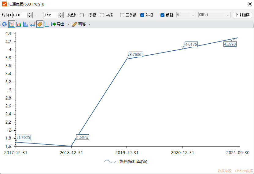 从净利率来看,自2018年起汇通集团净利率稳步提升,但整体仍处于较低水平。2021年前三季度,公司净利率为4.30%。