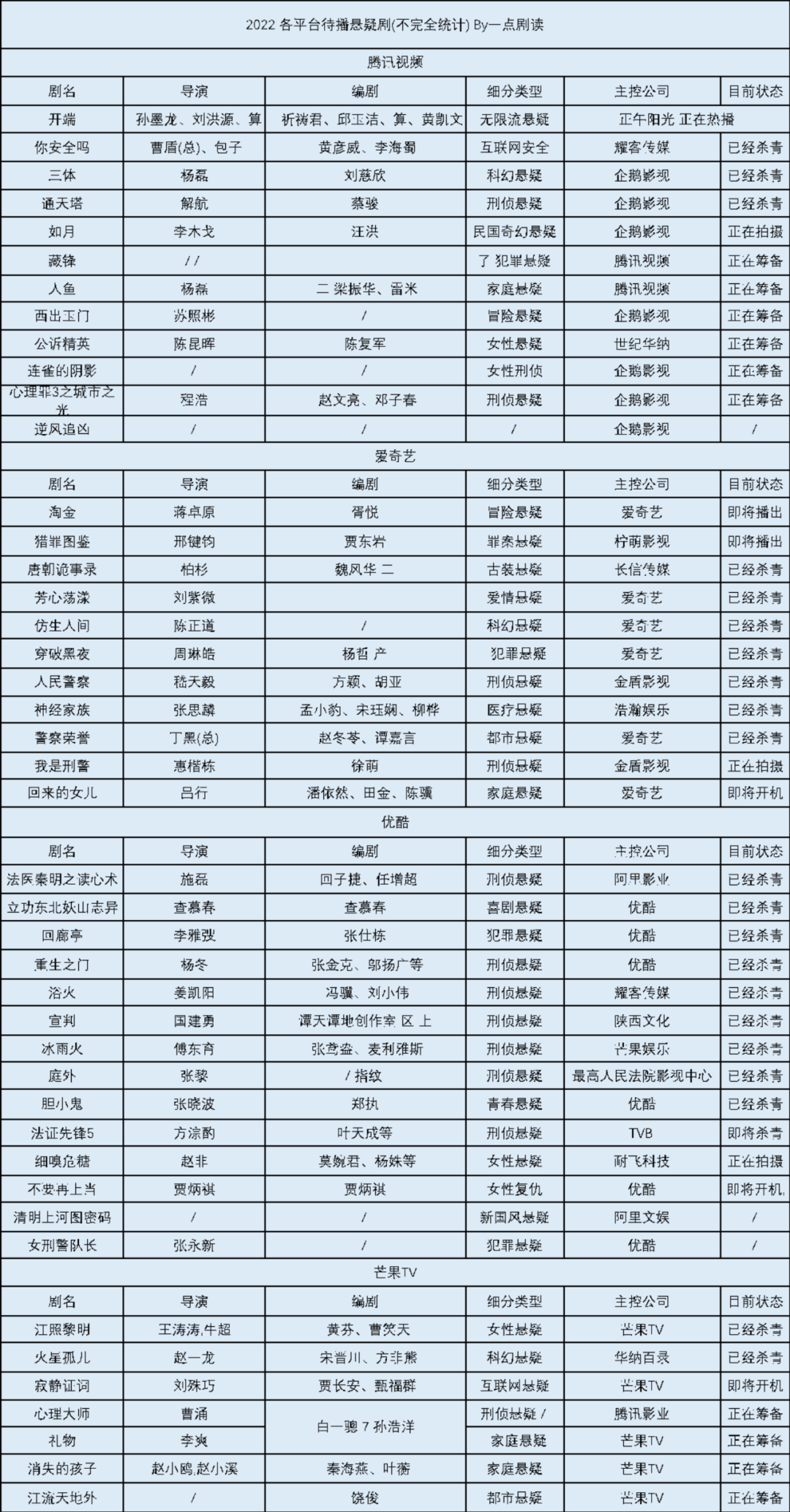 从另一个维度来看,这依旧是一部悬疑题材创作。一点剧读发现,今年依旧是悬疑剧大年。有数据显示,今年待播的悬疑剧数量达47部(仅根据当前各平台片单整理),占据剧集总量12.7%。