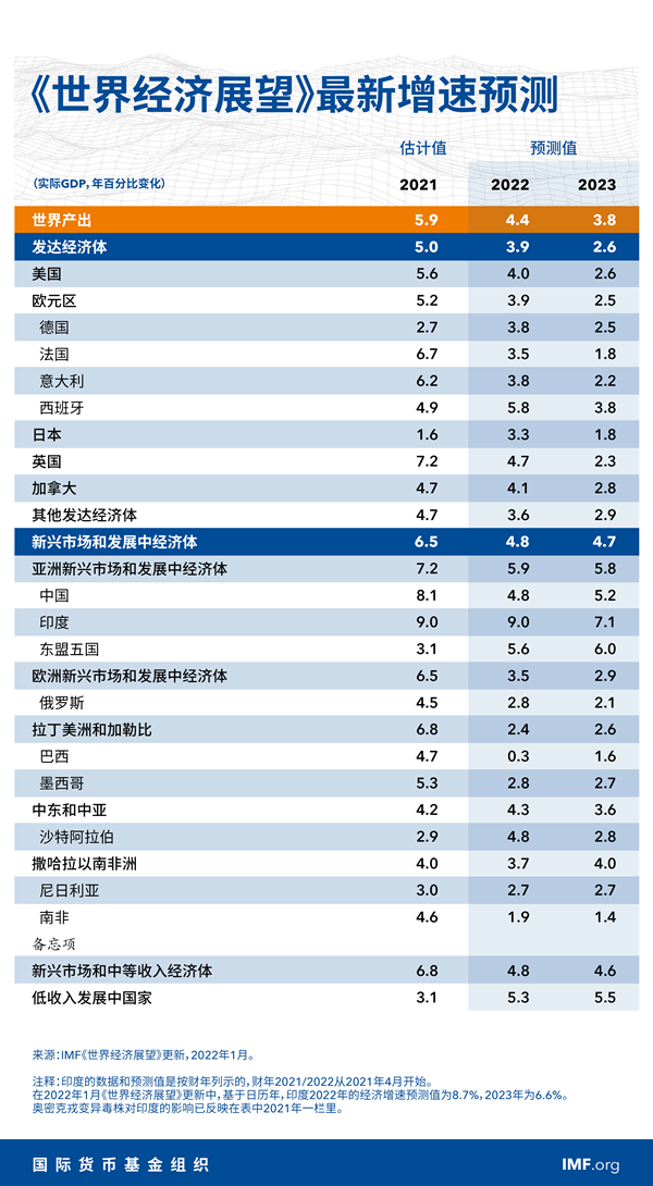 在周二发布的《世界经济展望》报告中,IMF预计,2022年全球经济将增长4.4%,相比去年10月的预测值下调了0.5个百分点;2023年经济增速将放缓至3.8%,但相比此前预测值高出0.2个百分点,这主要是因为随着当前抑制增长的各种因素消散,经济增速将有所回升。