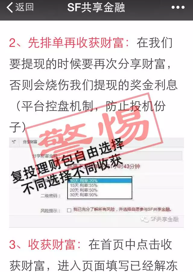 更值得注意的是,“SF共享金融”的制度规定,如果投资人要提现,必须先排单再收获财富,而再次排单的金额是1000元的整数倍,比你最初的投资额只多不少,这也就意味着,实际上投资人的钱只能拿到一部分,还有很大一部分是必须留在这个平台上的。当然,你可以强制提现,那么你的利息就会“烧伤”,也就是说,你只能拿会本金,眼睁睁看着自己挣到的利息飞走,还损失一开始注册会员时缴纳的100员激活费。