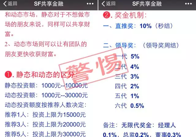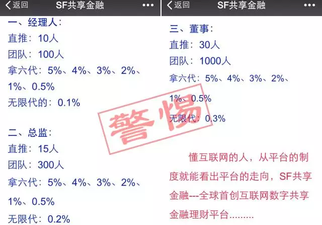 我们来“欣赏”一下SF共享金融的推荐人制度和奖金机制: